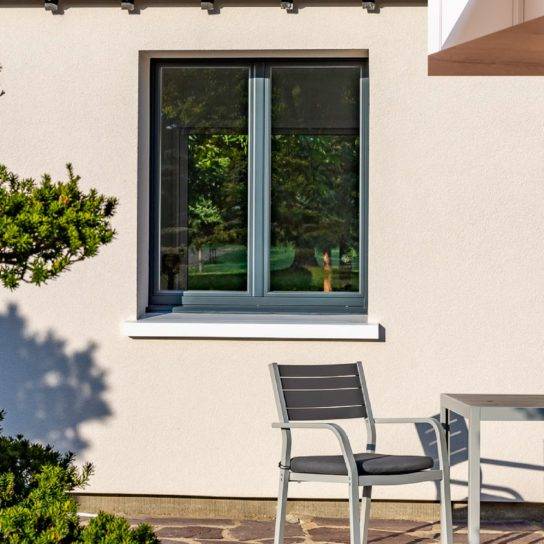 Fenêtre PVC 2 vantaux oscillo battant gris anthracite, pose en neuf ou rénovation.