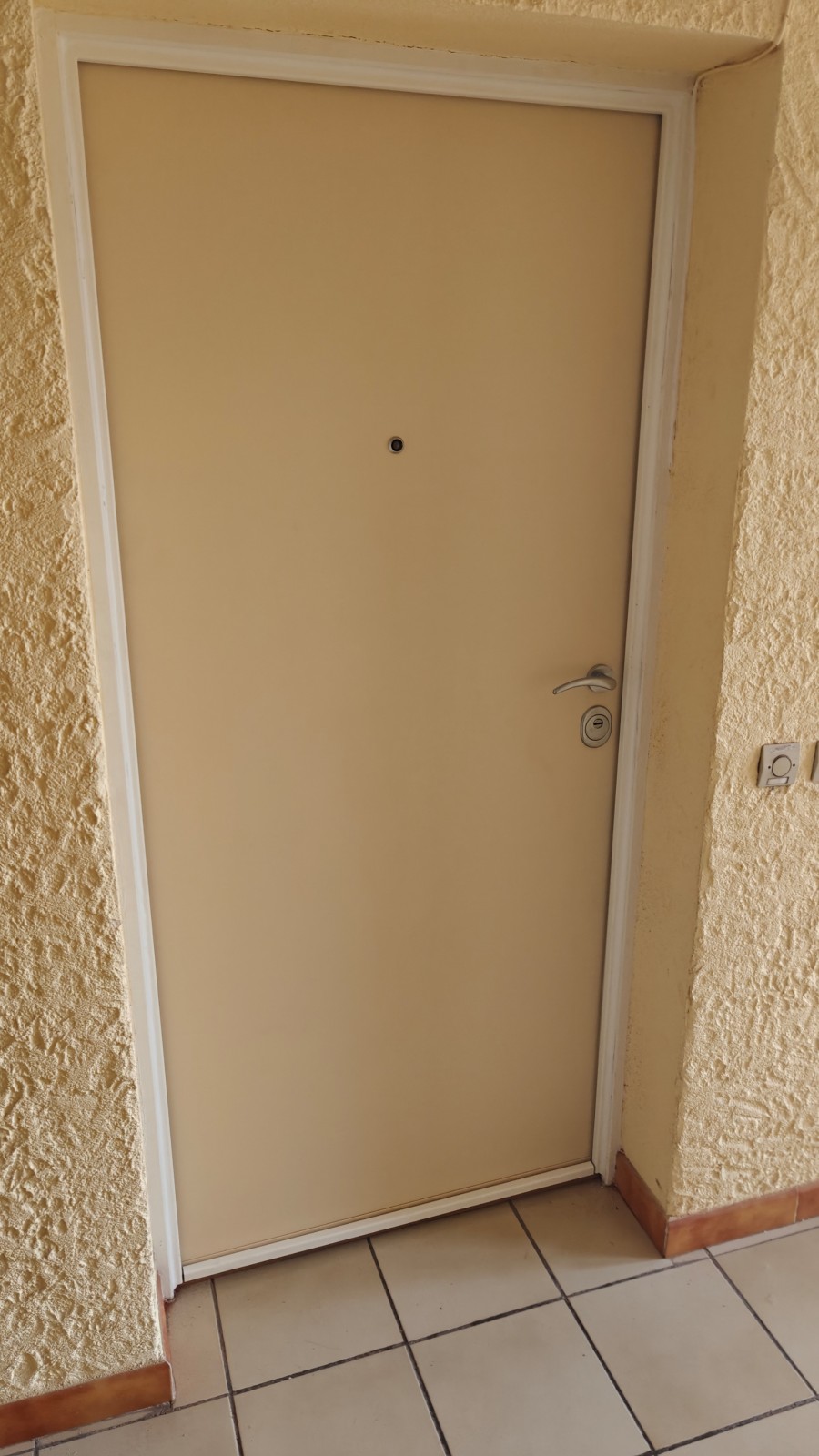 Pose d'une porte blindée à Carqueiranne, rénovation d'une ancienne porte palière des années 90, usimix a permis à sa cliente de poser une porte blindée à Carqueiranne sans reprise de finitions intérieures en conservant l'ancien dormant bois.